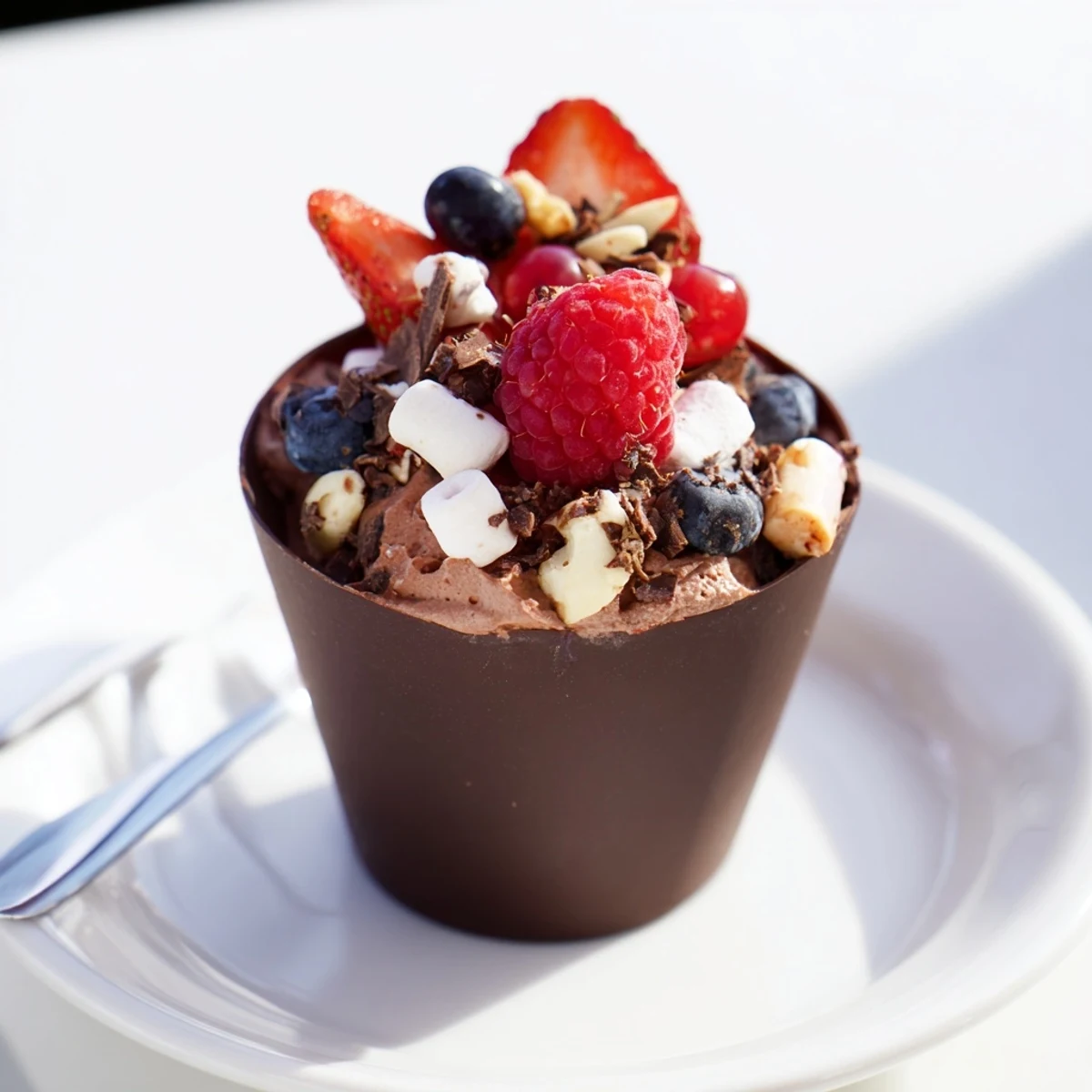 The moment I first served these at my sister's engagement party, watching guests' eyes widen as they realized those delicate chocolate cups were entirely edible—pure magic. I'd spent the morning carefully painting chocolate into cupcake liners, my kitchen smelling like a confectionery dream, wondering if they'd actually release from the molds. When they did, perfectly formed and glistening, I felt like I'd pulled off a culinary heist.