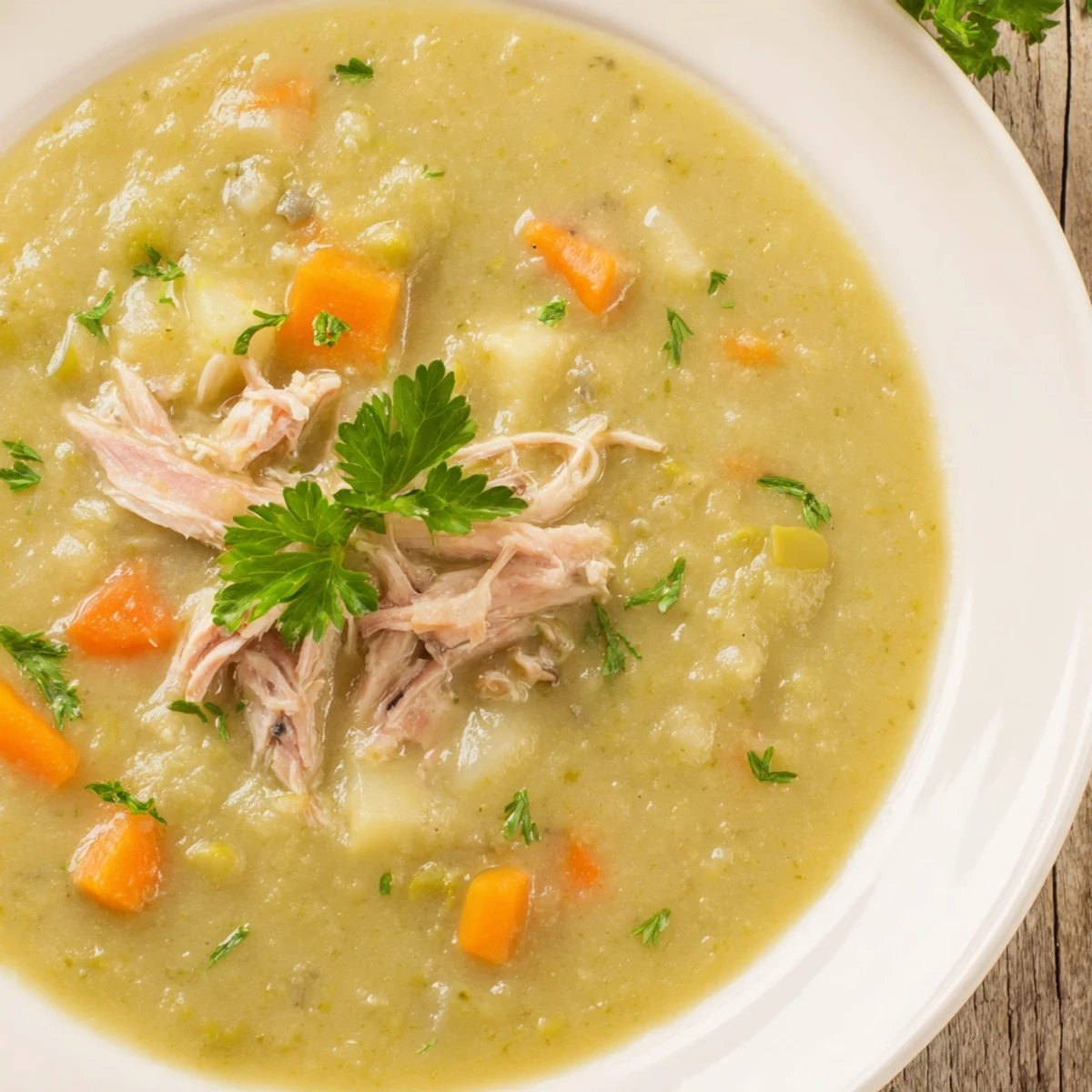 This warming soup combines tender green split peas with succulent smoked turkey leg for a comforting meal. Onions, carrots, celery, and garlic are sautéed then simmered with herbs and broth to build deep flavors. The turkey leg is removed, shredded, and returned, enhancing protein and smokiness. Optional potato adds thickness while parsley and croutons provide garnish. This hearty, gluten- and dairy-free dish offers satisfying texture and rich taste.