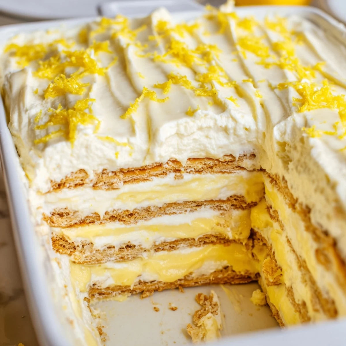 This refreshing chilled dessert features crispy honey graham crackers layered with a smooth lemon cream made from instant pudding mixed with freshly whipped heavy cream. After spreading the creamy filling between cracker layers, a tangy lemon glaze made from powdered sugar, fresh lemon juice, and grated zest is poured over the top. The entire creation requires at least four hours of refrigeration to transform the crunchy crackers into cake-like layers while the flavors meld together. Each slice delivers bright citrus notes balanced by sweet cream and the subtle honey flavor of the softened crackers.