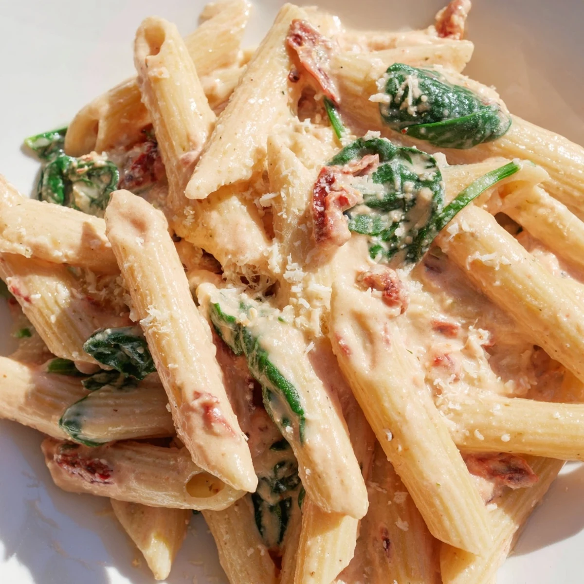 This one-pan creamy pasta brings together the tangy sweetness of sun-dried tomatoes with fresh baby spinach in a velvety Parmesan cream sauce. The entire dish cooks together in a single skillet, allowing the pasta to absorb all the flavors while creating a naturally thick sauce that clings beautifully to every bite.