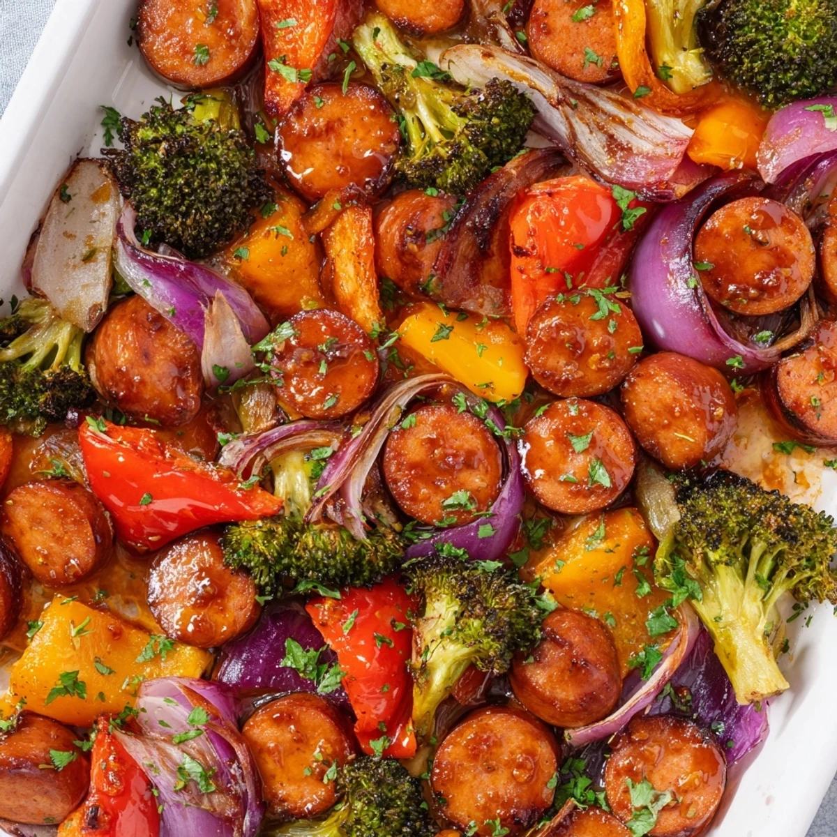 This hearty sheet pan dinner combines smoky kielbasa sausage with colorful broccoli, bell peppers, red onion, carrots, and cherry tomatoes. Everything gets coated in a balanced honey garlic glaze made with soy sauce, Dijon mustard, and smoked paprika, then roasted until caramelized and tender. The entire dish cooks on one pan in about 30 minutes, making weeknight dinner simple with minimal cleanup. Serve with fresh parsley and lemon wedges for brightness.