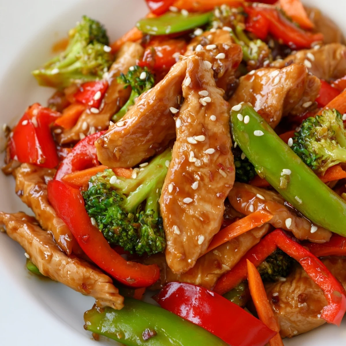 This vibrant stir fry combines thinly sliced chicken breast with colorful vegetables including red bell pepper, broccoli, carrots, and snap peas. The star of the dish is the homemade sesame-soy sauce, which brings together salty, sweet, and tangy notes with a hint of heat from optional sriracha.