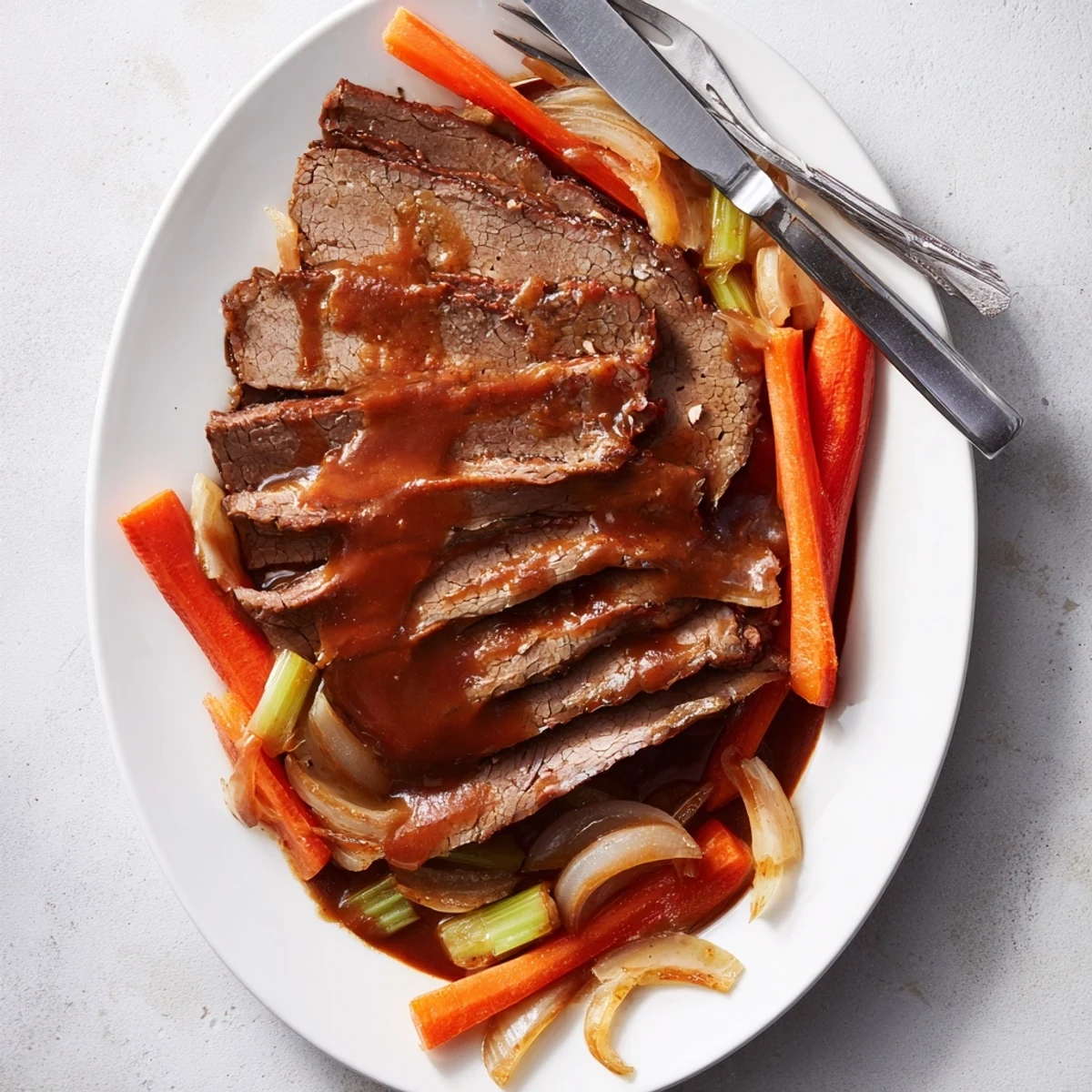 This tender beef brisket slow cooks for 8 hours with onions, carrots, celery, and garlic until it's fork-tender and incredibly flavorful. The rich, savory sauce combines beef broth, ketchup, Worcestershire, brown sugar, and smoked paprika for that perfect balance of sweet and tangy. Simply sear the meat, arrange the vegetables, pour over the sauce, and let your slow cooker do all the work. The result is melt-in-your-mouth brisket that's perfect sliced and served with the cooking liquid spooned over the top.