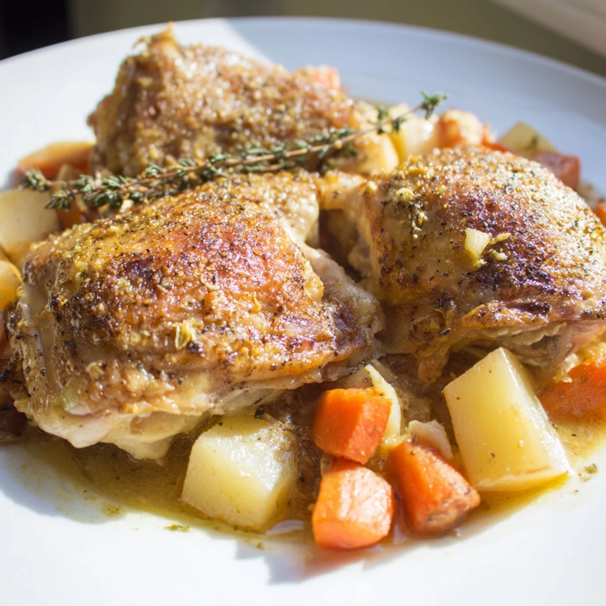 This comforting meal features bone-in chicken thighs slow-cooked alongside root vegetables like carrots and potatoes. The meat becomes incredibly tender after six hours of simmering in low-sodium chicken broth infused with dried thyme, rosemary, and paprika. Optional browning before cooking adds depth of flavor, while fresh parsley provides a bright finish. The dish naturally thickens into its own savory sauce, perfect for serving over rice or with crusty bread to soak up the juices.